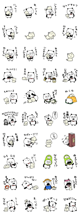 にしむらゆうじさんのパンダシリーズの中でも、ペット(?)の猫を連れているのが特徴的です。同意を求めるパンダに対して、少し無関心な表情の猫にクスっとしてしまう、シュールでゆるかわなスタンプです。