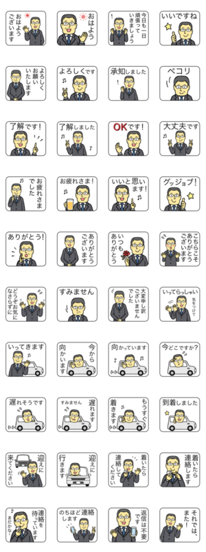 メガネのおじさんスタンプの第4弾。スーツ姿のおじさん、ビジネス編です。お仕事関係などにも使っていただけたら嬉しいです。どうぞよろしくお願いいたします。