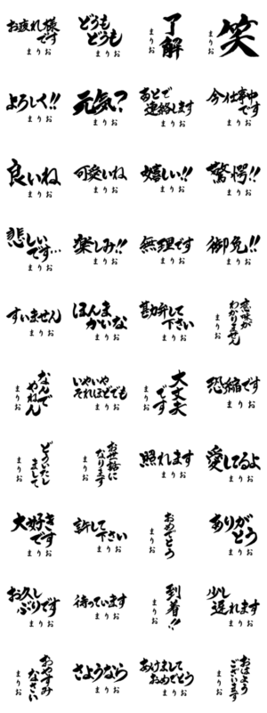 まりお(マリオ)さん専用筆文字スタンプ。キャラなし、デカ文字、シンプル。関西弁も少し。あいさつ、敬語、丁寧語も満載で使いやすい。