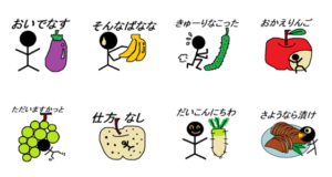 可愛いい食べ物のダジャレスタンプです。 わかりやすい定番ねた。 かわいい棒人間とコラボで絵文字をつくってみました。