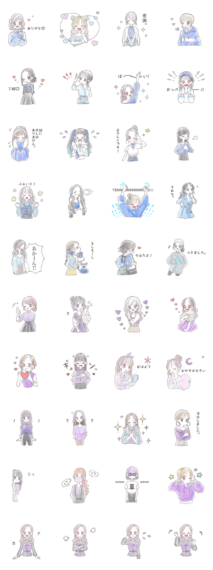 青色系や紫色系、寒色系が好きな人のためのスタンプです。可愛いファッションが好きな方にも!よく使う日常会話や、文字なしスタンプもあります。ハート多めです!