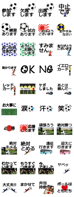 サッカーのクラブチーム、少年団、部活などなどの選手、保護者さまから監督さままで幅広く使えるスタンプです。参加や中止をスタンプ1つで連絡します★