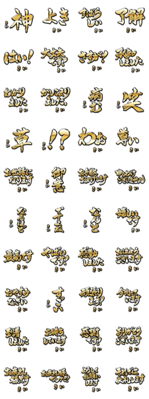 きい(キイ)さん専用、黄金の筆文字スタンプ。キャラなし、デカ文字、ゴージャス。友達、ママ友、仕事で使えるソフトなあいさつ、敬語、丁寧語満載!JK語も収録。イッレ・コスヤ より発売
