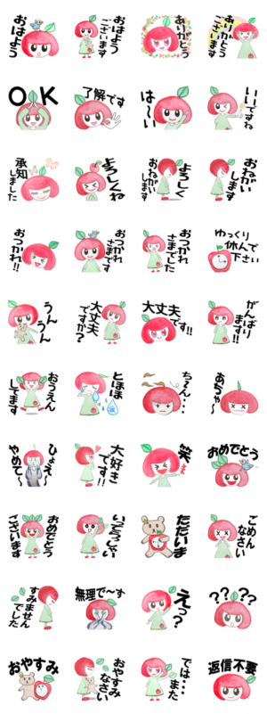 水彩色鉛筆で描いたりんごちゃんの日常会話(敬語多め)のデカ文字のスタンプです。どんな世代に方(お母さん世代や高齢者、シニア、老眼の方)にも見やすい大きな文字です。YUZUKI より発売
