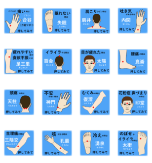 出先などでも自分で押せる手足や頭などにあるツボのスタンプです。 自分で使いたい時はもちろん、家族や友人が「頭痛いよ~」など困っている時に送ってあげてみて下さい。blue より発売