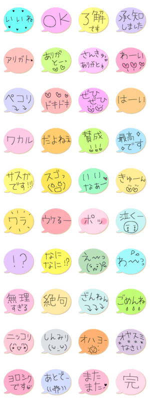 シンプルでさりげなく使えるふきだし40個。やさしいパステルカラーに大きめ文字で気持ちを伝えます。Konko3 より発売