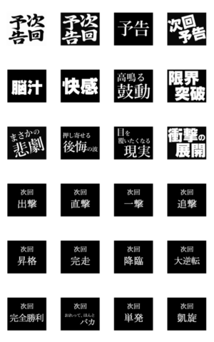 次回予告風のアニメーションスタンプです。激アツな予告から残念な報告まで組み合わせ次第でいろいろ遊べます。