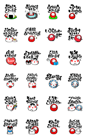 日本の縁起物(おかめさん、ひょっとこ、だるま、招き猫、犬張子など)の敬語スタンプです。真 より発売