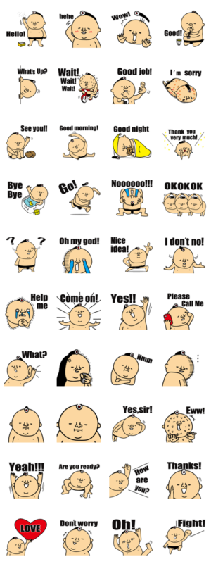 お相撲さんの英会話スタンプ。大きい文字で使いやすい日常英語です。ちょんまげがお寿司(鉄火巻き)の力士です。簡単に使える英語なので外国の友達とのトークにおススメ。naka より発売