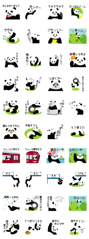神戸弁の白黒パンダスタンプ第3弾。のんびりゆるーいてきとーぱんだです。明石・垂水・須磨・六甲道など兵庫県はもちろん、大阪、京都など関西弁エリア全域で使ってね。米つぶ より発売