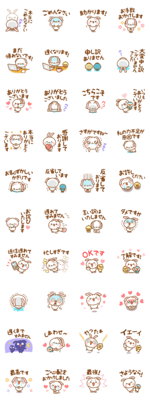 感謝、お礼、お詫び、お願いなどの挨拶によく使う敬語をセットにしました♪ 涙もろい「たれ耳うさぎ」が心を込めてお手伝いします♩ 仲間たちも応援出演していますよ〜♫