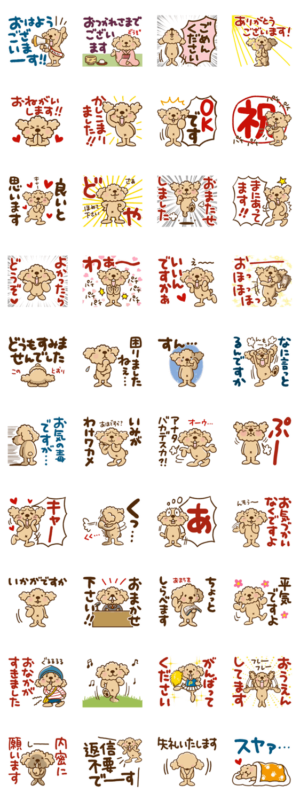 限りなく人間に近いリアクション犬、トイプードルのぷう太郎の敬語スタンプ。読みやすいデカ文字でよく使う敬語と丁寧な言葉を集めました。