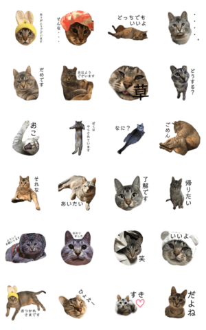 猫のポッキーの日常で使えるスタンプです。真顔がポイント!ワインハウスの住人 より発売
