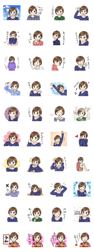 女子、主婦、 大人女性が使いやすい、漫画っぽいイラストのスタンプです。令和スタンプやお正月に使えるスタンプもあります。ショートヘアバージョン。