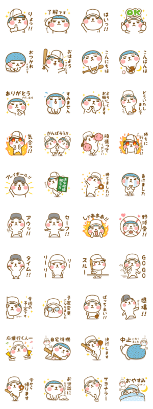 しろくてまんまるなきゃら『モチモチもちまるん』が今度は『球児』になってみたよ。野球好きな方はぜひ!よく使う言葉でセットにしてみました。Hikayuhi より発売