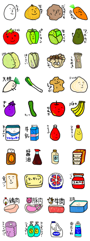 卵、玉ねぎ、じゃがいも、にんじん、牛乳、醤油やソース等の調味料、納豆、豆腐、トイレットペーパーやシャンプー等の日用品、ちょっと買い物頼みたい時のスタンプ