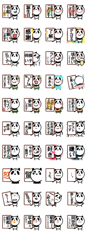 パンダのパンダンヌはフラダンスのスタジオに通います。このスタンプはフラスタジオに通うパンダンヌの日常を描いたものです。改元記念。新元号報告ポーズスタンプです。