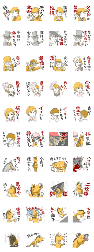競馬ファンに贈る、個性的なキャラたちが織り成す競馬劇場スタンプです。 競馬好きな仲間同士の会話にどうぞ。もちろん日常会話でも使えます。スタジオ・ドリ より発売