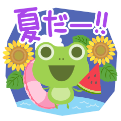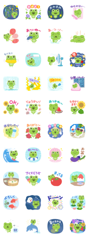 カエルのキャラクター「かえるちゃん」の夏のスタンプです。 七夕、朝顔、ひまわり、花火、海、台風、お祭りなどなど盛りだくさんです♪