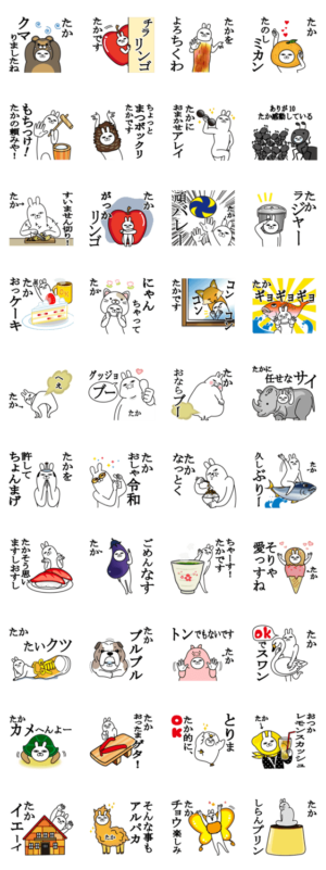 たかが使う面白名前スタンプダジャレ編7。タカチャン,たかちゃん,たかし,たかお,たかひろ,たかゆき,たかあき,たかのり,たかよし,たかふみ,たかや,隆,孝雄,隆弘,孝則など