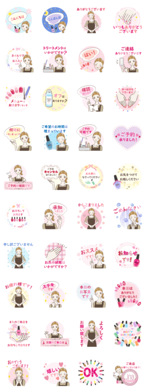 ネイルサロンで使えるネイリスト・スタッフとお客様とのコミュニケーション(予約受付、連絡、お礼、挨拶など)用JNAオリジナルスタンプ。