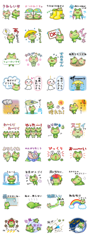 かえるちゃんの梅雨のご挨拶スタンプです。雨、風、台風、もちろん晴れの日にも使ってください。coyuri より発売