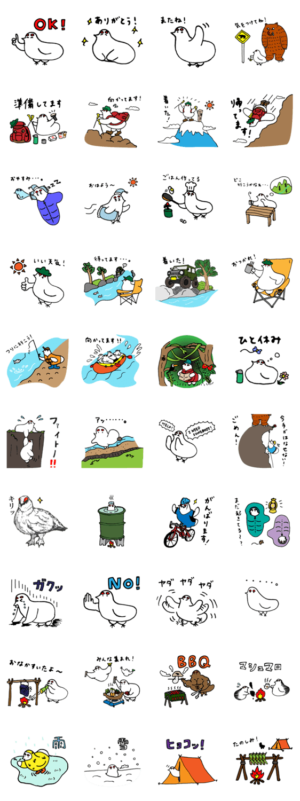 日本アルプスの高山帯に氷河時代から生息しているふわふわのライチョウ(雷鳥)が、登山やキャンプなどアウトドアアクティビティーを楽しんでいる姿をスタンプにしました。Alps no Shonen より発売