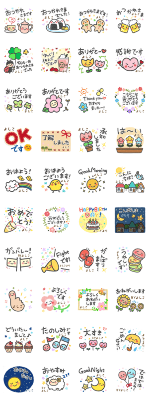 [よしこ]専用のふんわりと気持ちを伝えられる大人かわいい名前スタンプです。毎日無難に使える日常会話を収録★佳子/好子/芳子/嘉子/喜子/善子/吉子/賀子/恵子/良子/ヨシコ