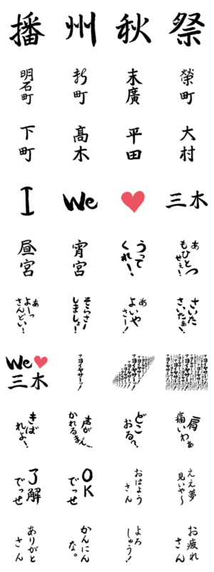 兵庫県の三木市(播州、播磨地方)の秋祭りスタンプです。 播州弁の掛け声が独特の雰囲気を醸し出します。伝統的なお祭りに相応しく渋くカッコイイ筆文字で仕上げました。