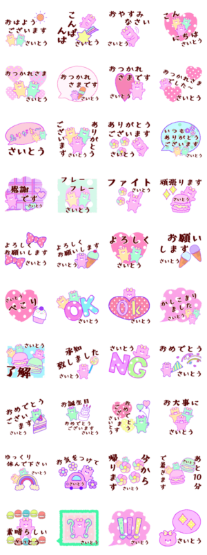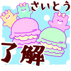 名前さいとう斉藤/くまゆめかわイイ/使えるおしゃれパステルカラー/敬語スタンプ/ハート/スイーツ/リボン/承知致しました/おめでとう/了解/お大事に/ゆっくり休んで下さい