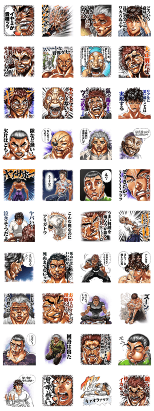 連載25周年を迎える格闘マンガの金字塔「刃牙」シリーズのスタンプが登場ッッ!!全シリーズからの名セリフ・名シーンを選りすぐり!!強くなりたくば使用えッッ!!