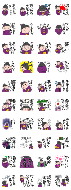 少し関西弁が混じってる着物姿のお婆ちゃん。ばあばからお年寄りならではのちょっとシュールな一言も可愛いく。老人・高齢でなくてもちょっと年上の方なら自虐的に使えますPush Champy より発売