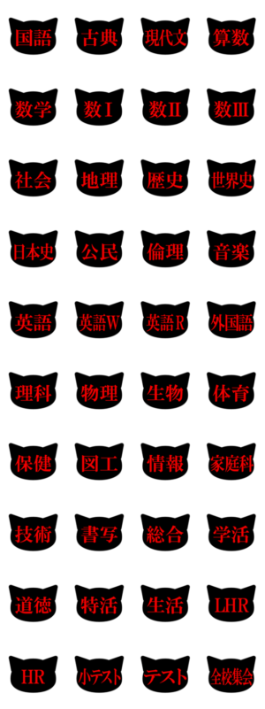 ネコ型でロックなみんなの時間割・教科スタンプです。 小学生、中学生、高校生、先生も使っていただけると思います。 スクールライフのお手伝いになれば幸いです。