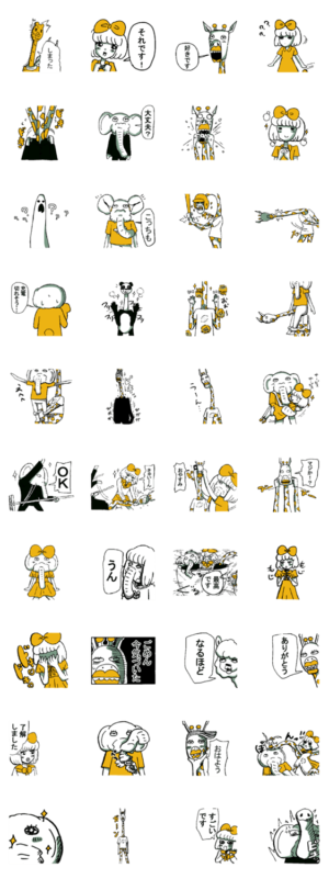 キリンとゾウと女の子の4コママンガ【レモンスカッシュ・バナナシェイク】のスタンプです。 返信に困った時にちょうどいいスタンプです。