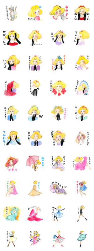 イラストレーターhisaeの描くLINEスタンプ第一弾。 金髪のかわいい女の子アリーちゃんと仲間たち