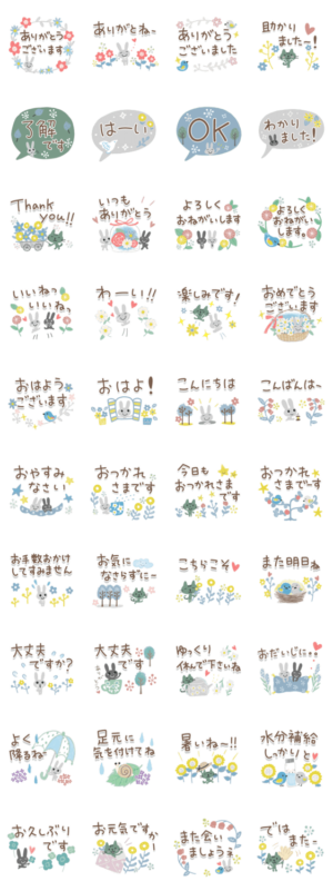 毎日使えるスタンプにナチュラルカラーでお花いっぱいにしてみました。よく使う言葉多めです。ひらりーーの大人カワイイ。スタンプver17です。敬語/挨拶/日常/うさぎ/猫/鳥ひらりーー より発売