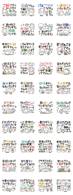 まるぴのスタンプ44作目です!気遣いの言葉、デカ文字、カラフル、基本のセットです。かなぴ より発売