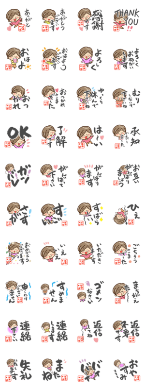 『おばあちゃんスタンプ』スタンプから『書道編』の登場です。文字を墨で描いた、習字風の、可愛いスタンプです。文字が大きく目立ちます。優しいおばあちゃんにぜひ。
