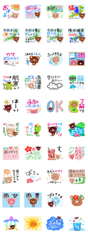 天気予報もできる♪毎日使える、便利なお天気スタンプセットです。 雨・晴れ・くもり・暑い日・寒い日。基本の挨拶も入っています。ようこ より発売