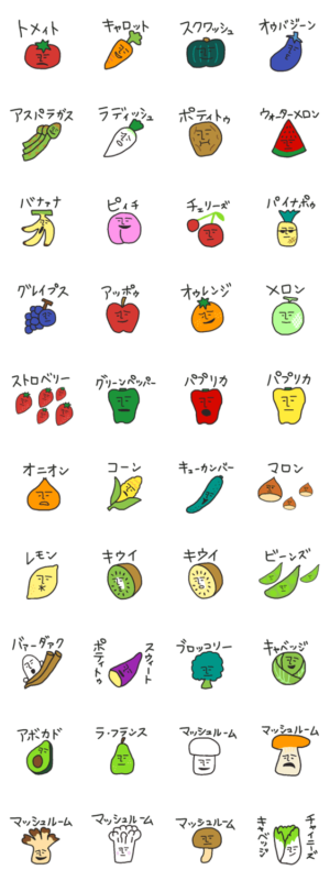 色々な食材がモアイ顔になった絵文字に誇張した英語読みのフリガナを付けたスタンプにしました。カラフルな色合いにシュールな表情が可愛いよ。