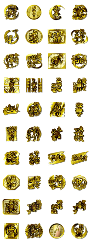 超金ピカでゴージャスなゴールドでか文字、おはようからおやすみ、毎日使える日常会話と、御意、誕生日のお祝い、応援、返信不要など、和をテーマに豪華に金文字で伝えますハッピーリンク より発売