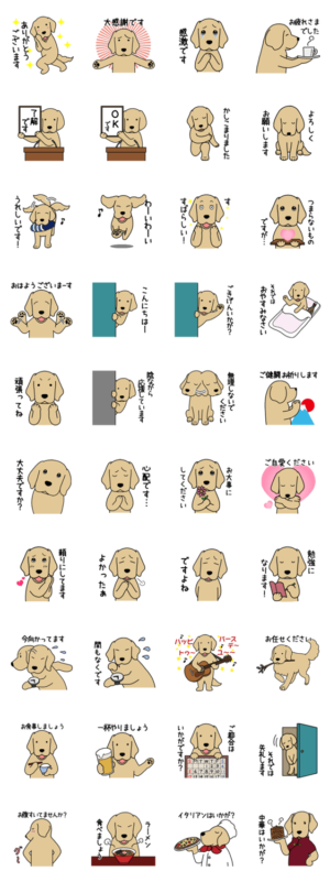 ゴールデンレトリバーのスタンプ第6弾(毎日使える気遣い編)です。日々のコミュニケーションに使える優しい言葉遣いのスタンプです。大きな子犬が大人になりました。