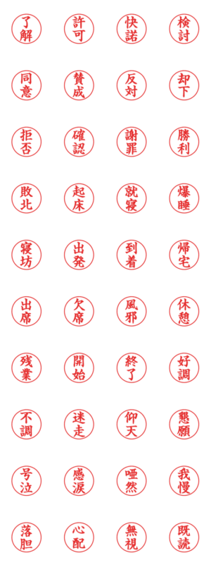 シンプルな業務用はんこ、印鑑、認印、スタンプ。了解、許可、同意、拒否、寝坊、残業、休憩、風邪、欠席、不調、我慢、無視、既読など、使えるワードを盛り込みました。studio-bluedice より発売