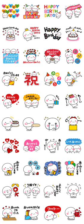 しろくてまるいキャラクター「しろまる」のお誕生日スタンプです。お誕生日をお祝いされたときに使える専用お返しスタンプ付きです。【作:いしいともこ】