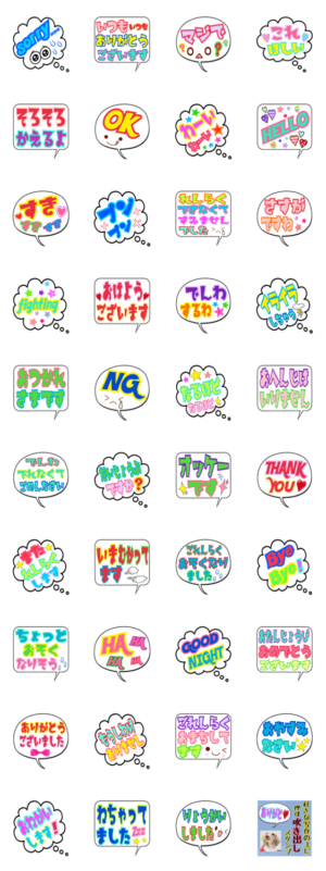 自分や好きな人の写真、ペットの写真を送信する前に、このスタンプを貼り付けて、オリジナル文字入り吹き出しスタンプを作ってみて下さい!(カラフルな日常編)