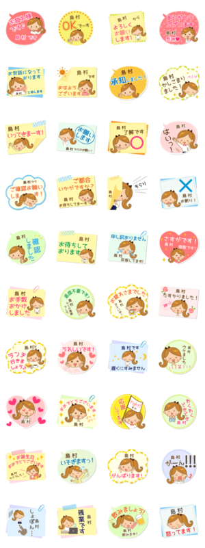 しまむら/島村様用★ふせん風大人女子向け日常会話マナーと会社お仕事の丁寧敬語ご挨拶フセンスタンプ!名前入り付箋メモ/OLしごと/職場業務連絡/毎日伝言報告/なまえ姓苗字お名前入りスタンプ専用★アイシスデザイン株式会社 より発売