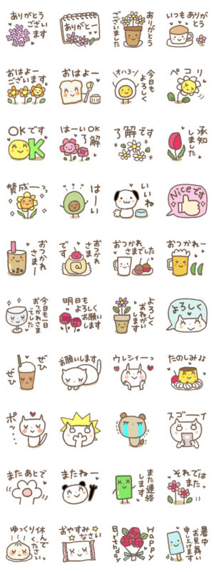 シンプルなイラストと大きな見やすい文字で使いやすい40個。花いっぱいの優しいスタンプです。感謝と挨拶、暑中見舞いも便利。丁寧語多めです。