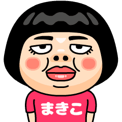 まきこ(マキコ)はとってもブスな女の子。自分の名前入りピンクTシャツを着るちょっと痛い子。自虐的だけどおはようからおやすみまで使える万能な名前スタンプです。