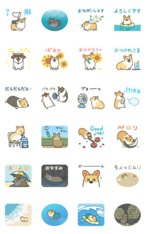コーギーの動くスタンプ「夏」バージョンです。夏の日常やイベントでコギの成分が欲しくなったらお使い下さい。たきむら りゅう より発売