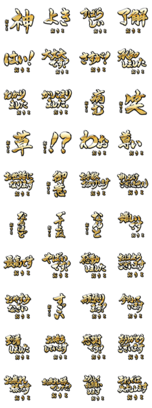 おりこ(オリコ)さん専用、黄金の筆文字スタンプ。キャラなし、デカ文字、ゴージャス。友達、ママ友、仕事で使えるソフトなあいさつ、敬語、丁寧語満載!JK語も収録。